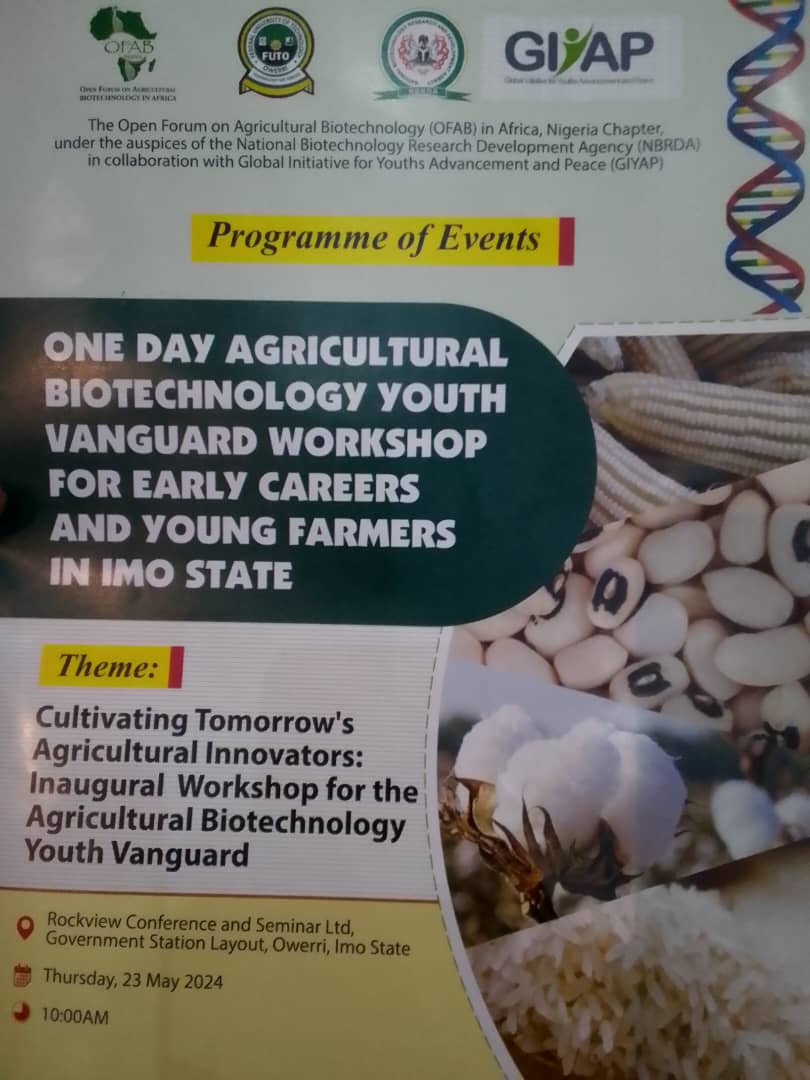 The workshop organized by the National Biotechnology Research Development Agency ( NBRDA) , in collaboration with Global Initiative For Youths Advancement and Peace ( GIYAP) , was well attended by agricultural stakeholders within and outside Imo. Which was tagged: “One Day Agricultural Biotechnology Youth Vanguard Workshop For Early Careers And Young Farmers In Imo State”.
